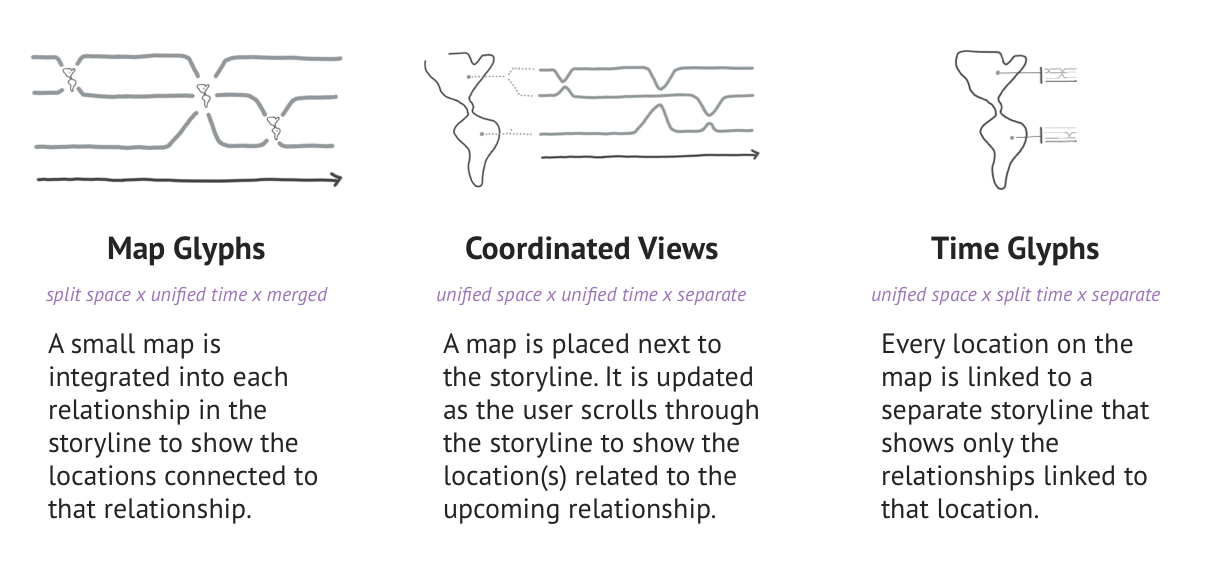 I started by searching for a visualization in the academic research on Storylines. I found 15 papers describing different ways to augment Storylines. Some even have locations!