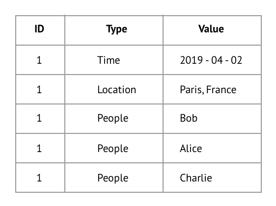 As you can see in the example, each row in the dataset contains on of these three types of datapoints. The datapoints from one article are linked together through a shared ID.