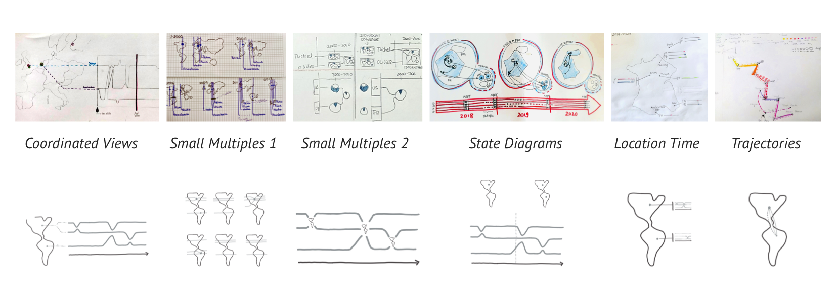 • We eliminated the two designs that use paths on maps because they struggle to show when two people are linked to the same location but at different times.