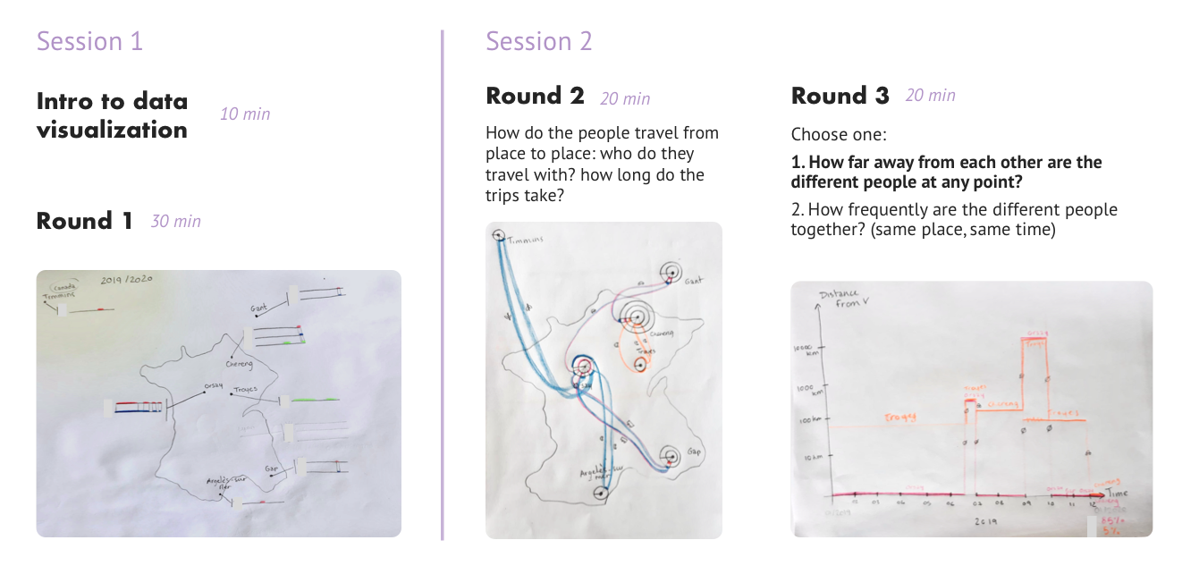 I recruited 11 participants and divided them into 4 groups. Each group participated in two sessions of 1 hour in which they drew at least three visualizations. Below you can see an illustration of the process.